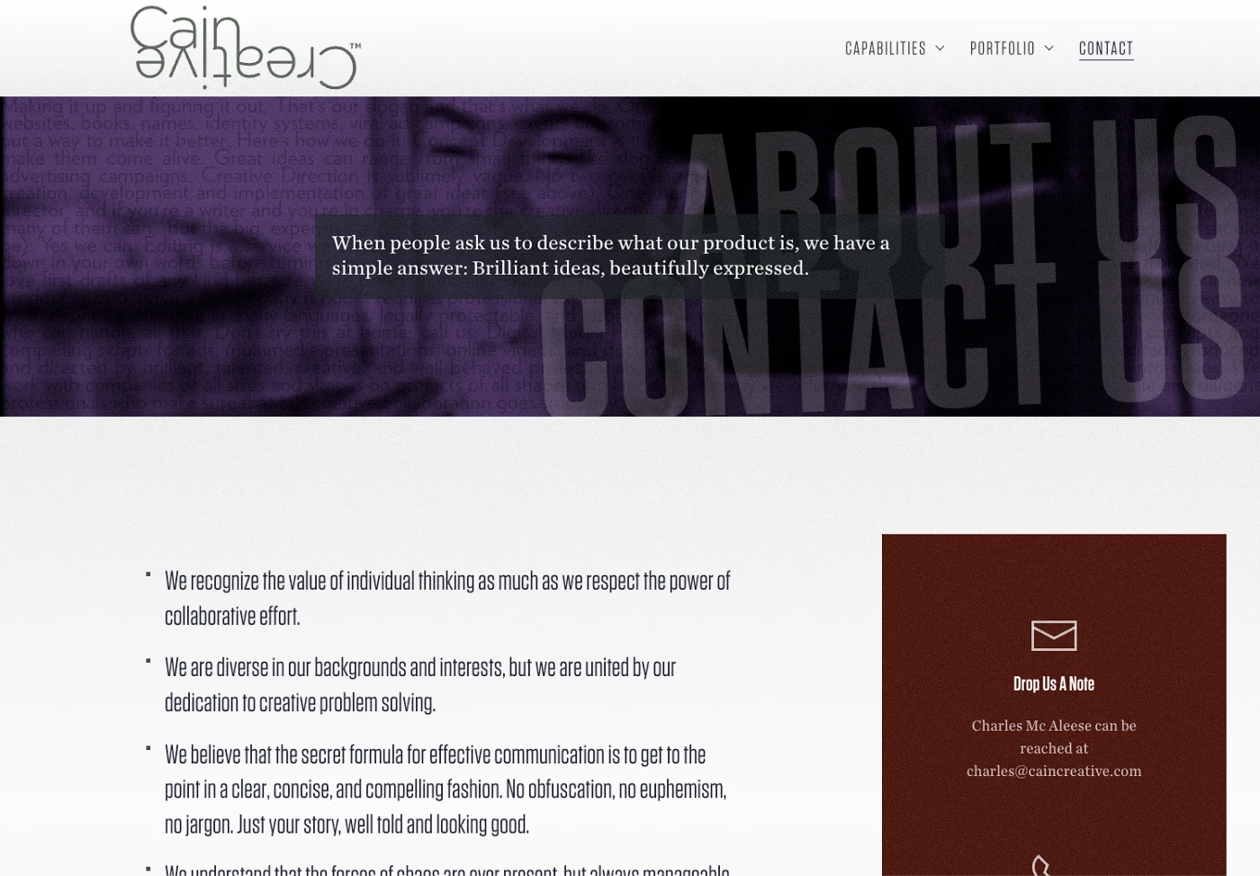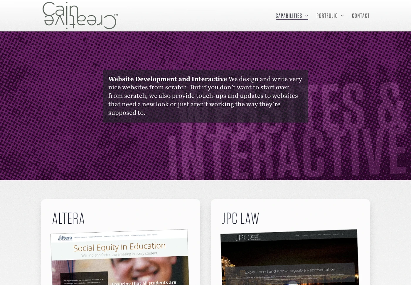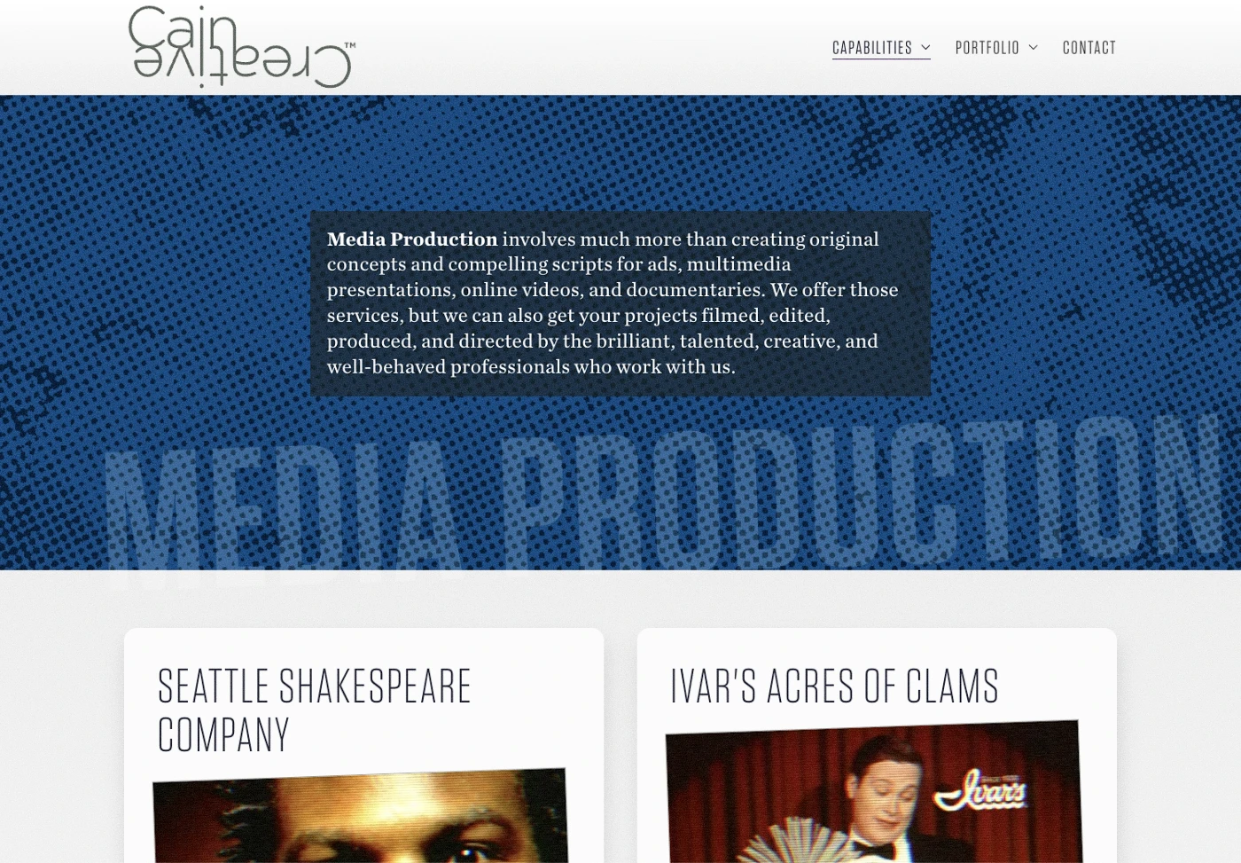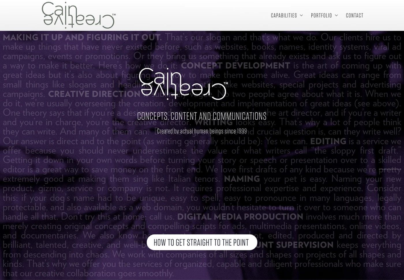 Cain Creative has a long history of working with major consumer and technology brands, and their new site needed an attitude of being slightly askew in words and pictures. So we tipped everything a few degrees, including titles and hero pics, as a fundamental part of their look.