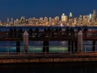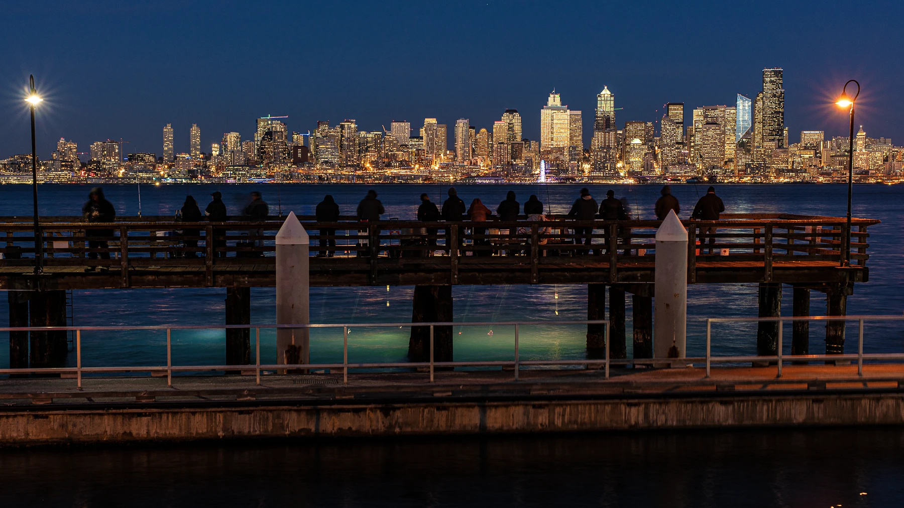 A night shot of the Seattle waterfront, with people jigging for squid from West Seattle.