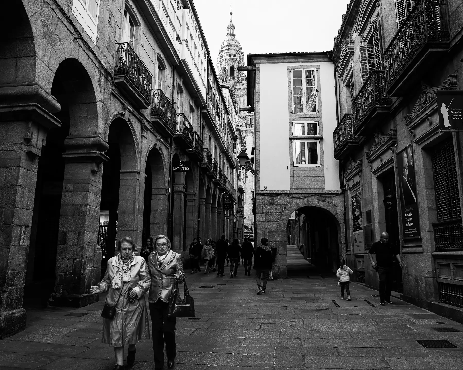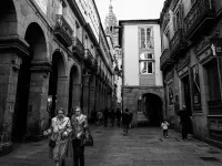 Fashionistas stroll through the old town of Santiago de Compostela, Spain.