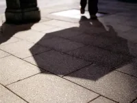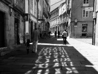 The light reflected from wavy old glass windows creates a pattern that looks almost like runes on the street in Santiago, Spain.