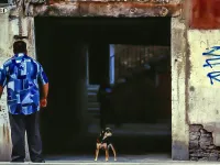 A man and his guard dog patrol the canal outside his home in Venice, Italy.