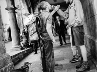 Backpackers have a disagreement after completing the Camino pilgrimage in Santiago de Compostela, Spain. (Side note: SdC is the happiest place on earth. These folks were the exception)
