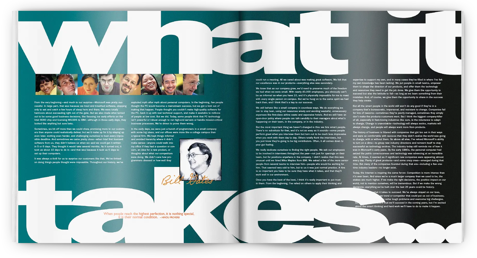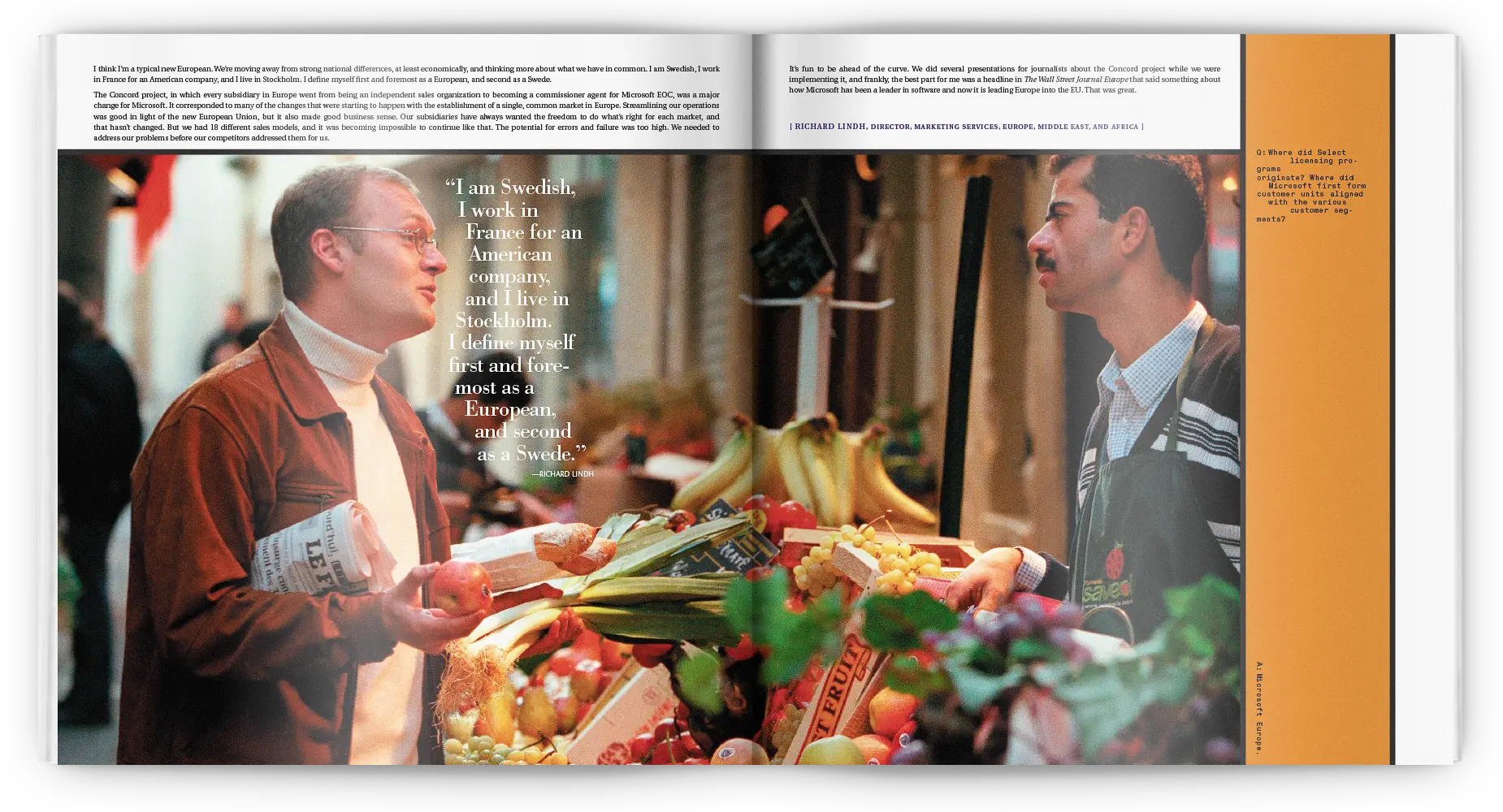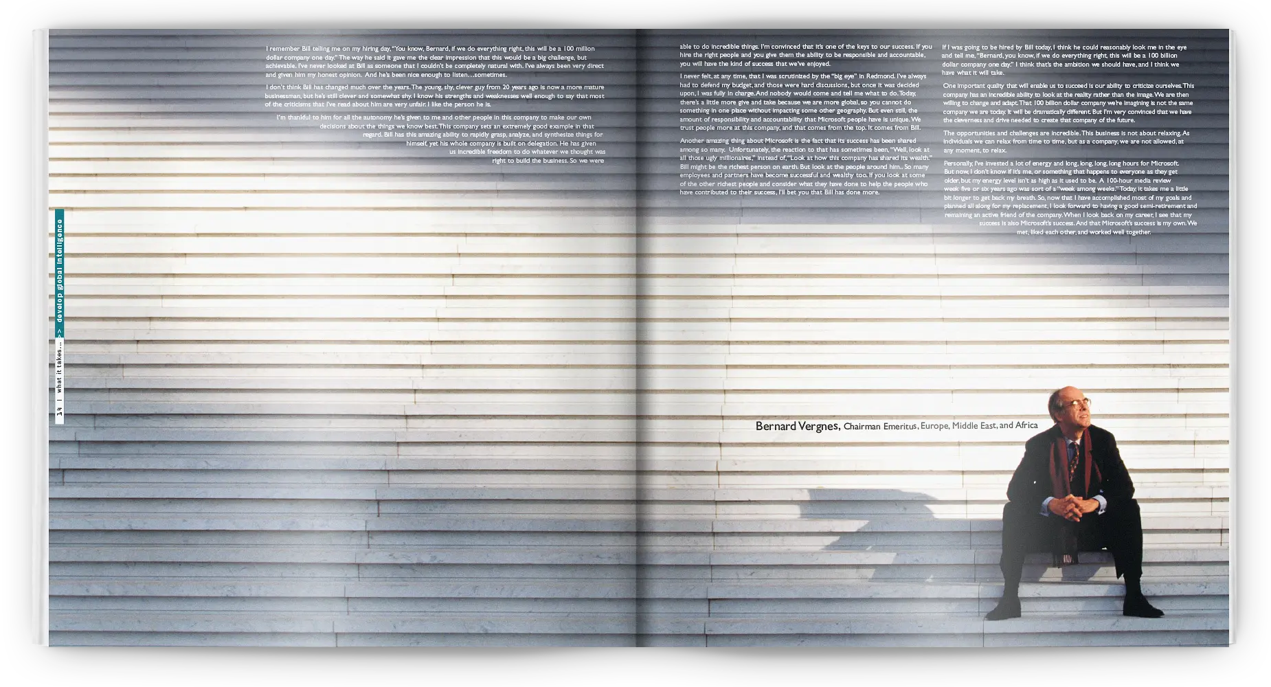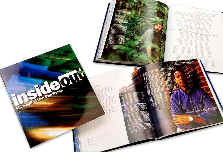 Three main goals were successfully achieved: the book was delivered to 45,000 employees (each listed in 2.5-point type in the endpapers), copies were printed domestically and internationally for bookstores, and we’re still seeing some of the images in Microsoft’s materials years later.