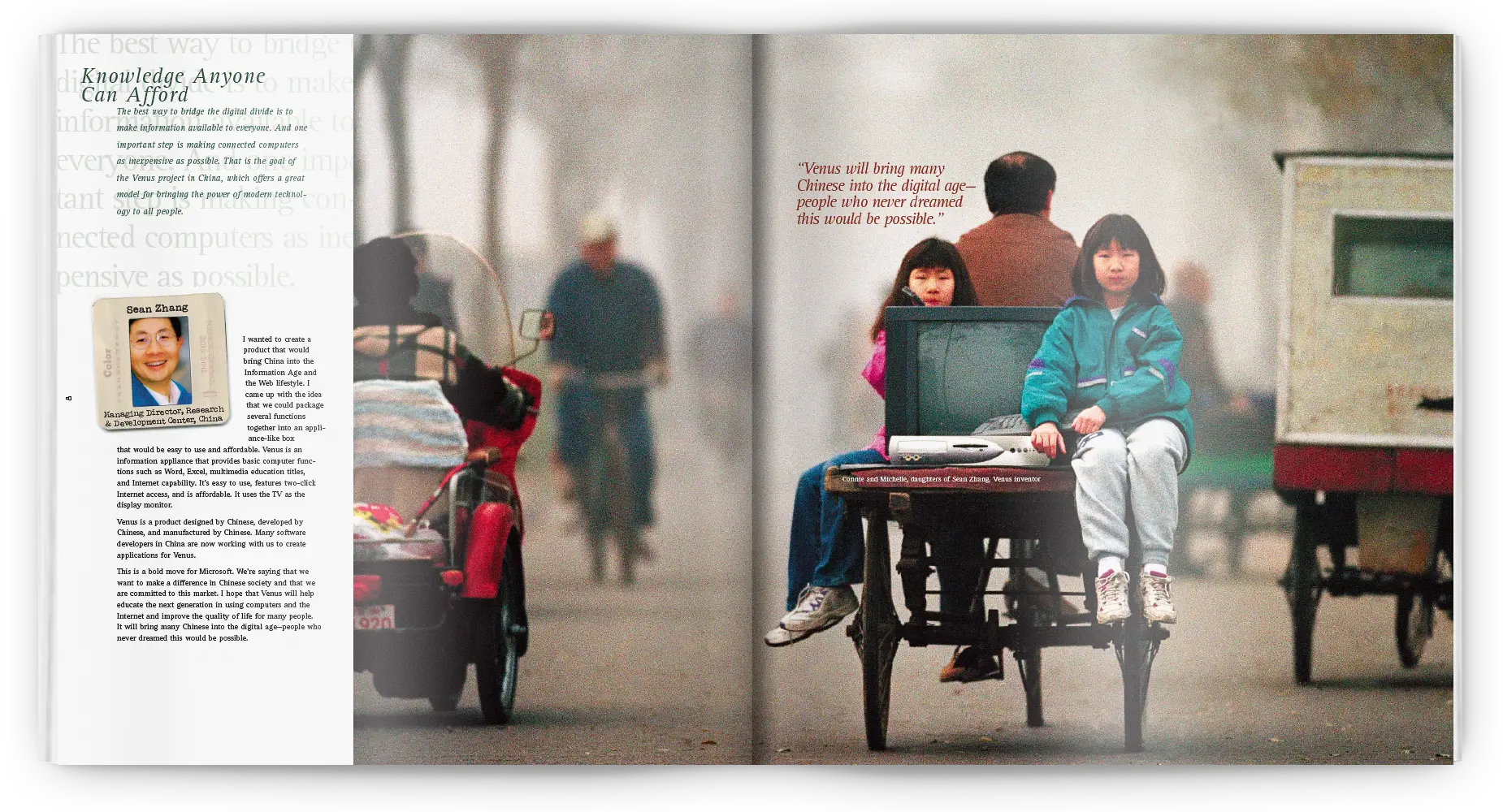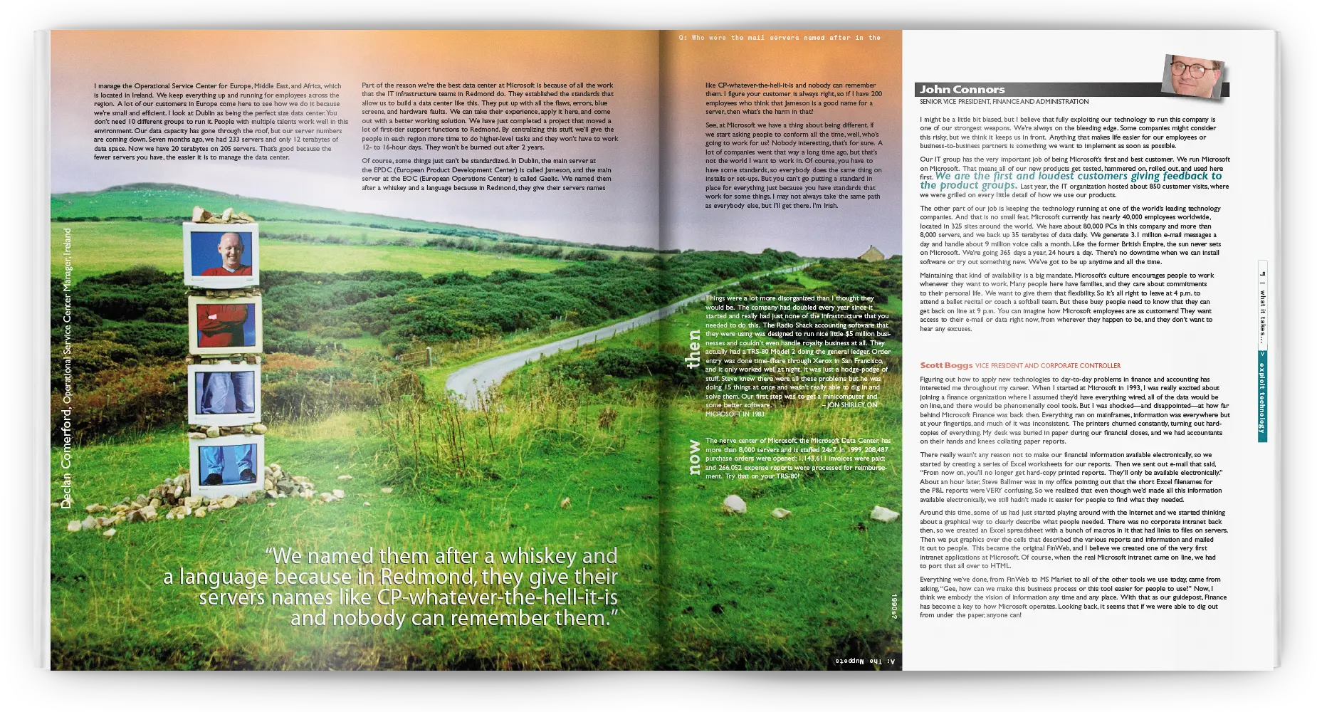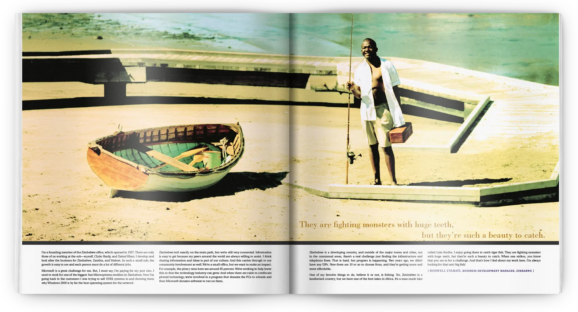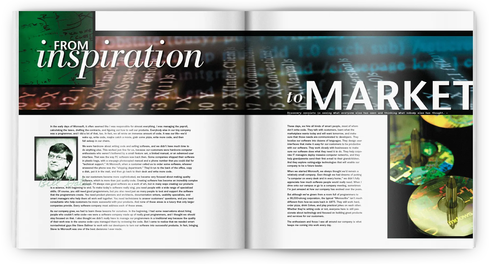Three main goals were successfully achieved: the book was delivered to 45,000 employees (each listed in 2.5-point type in the endpapers), copies were printed domestically and internationally for bookstores, and we’re still seeing some of the images in Microsoft’s materials years later.