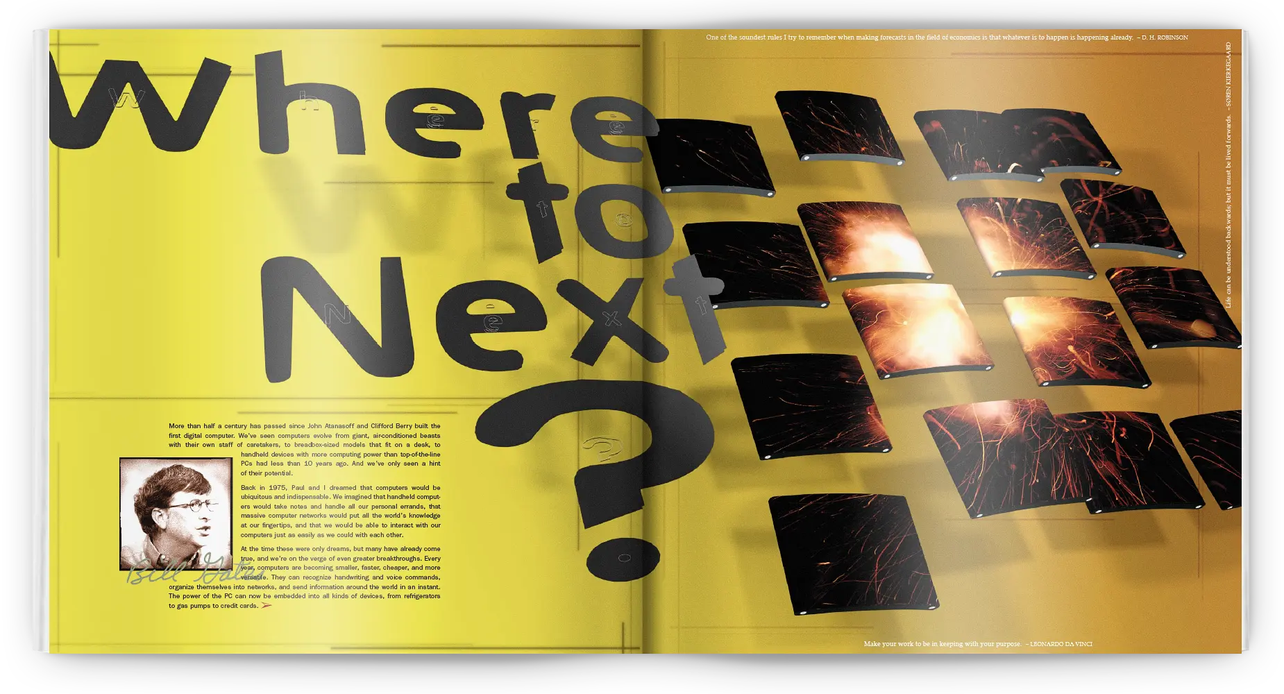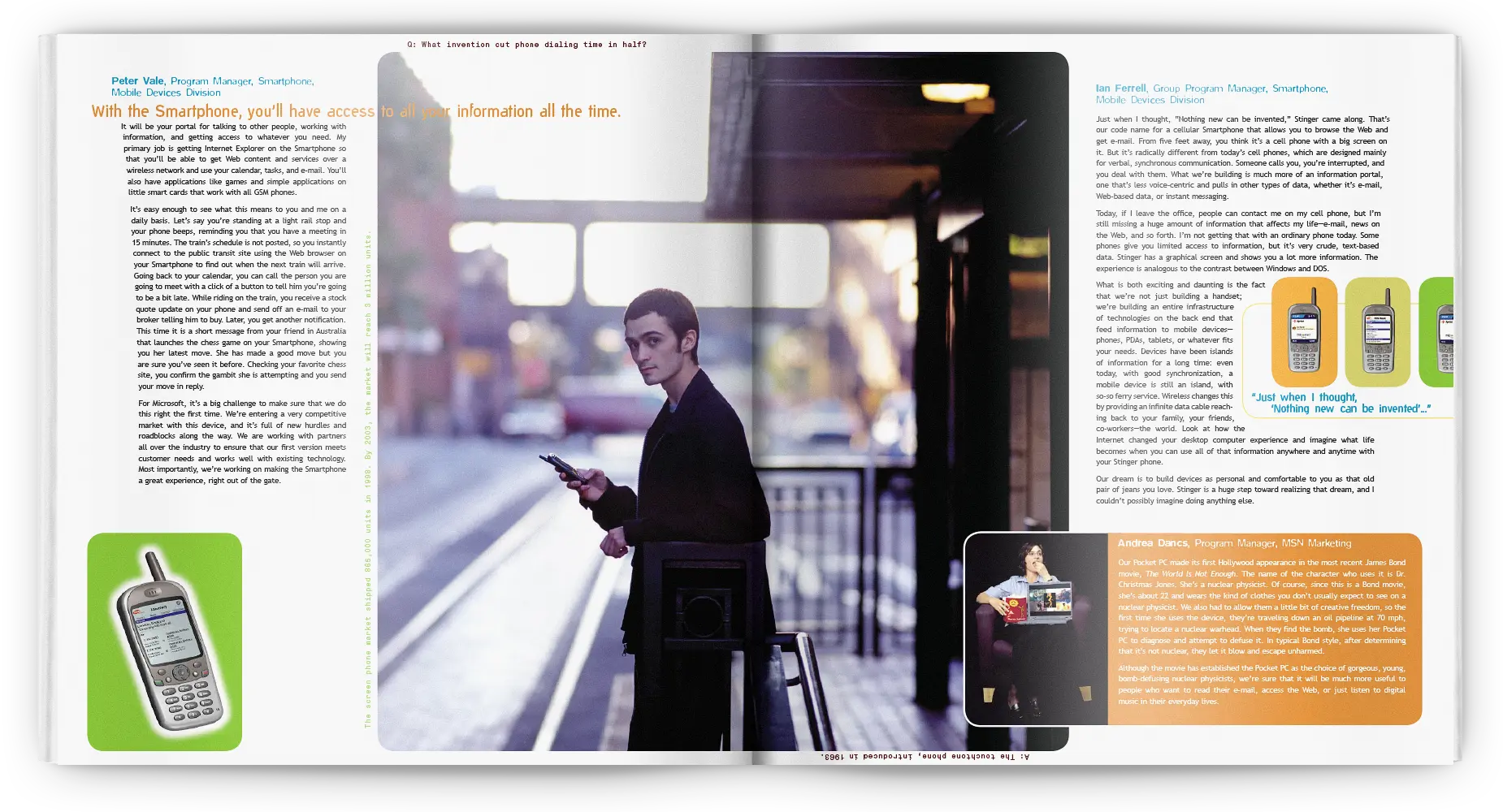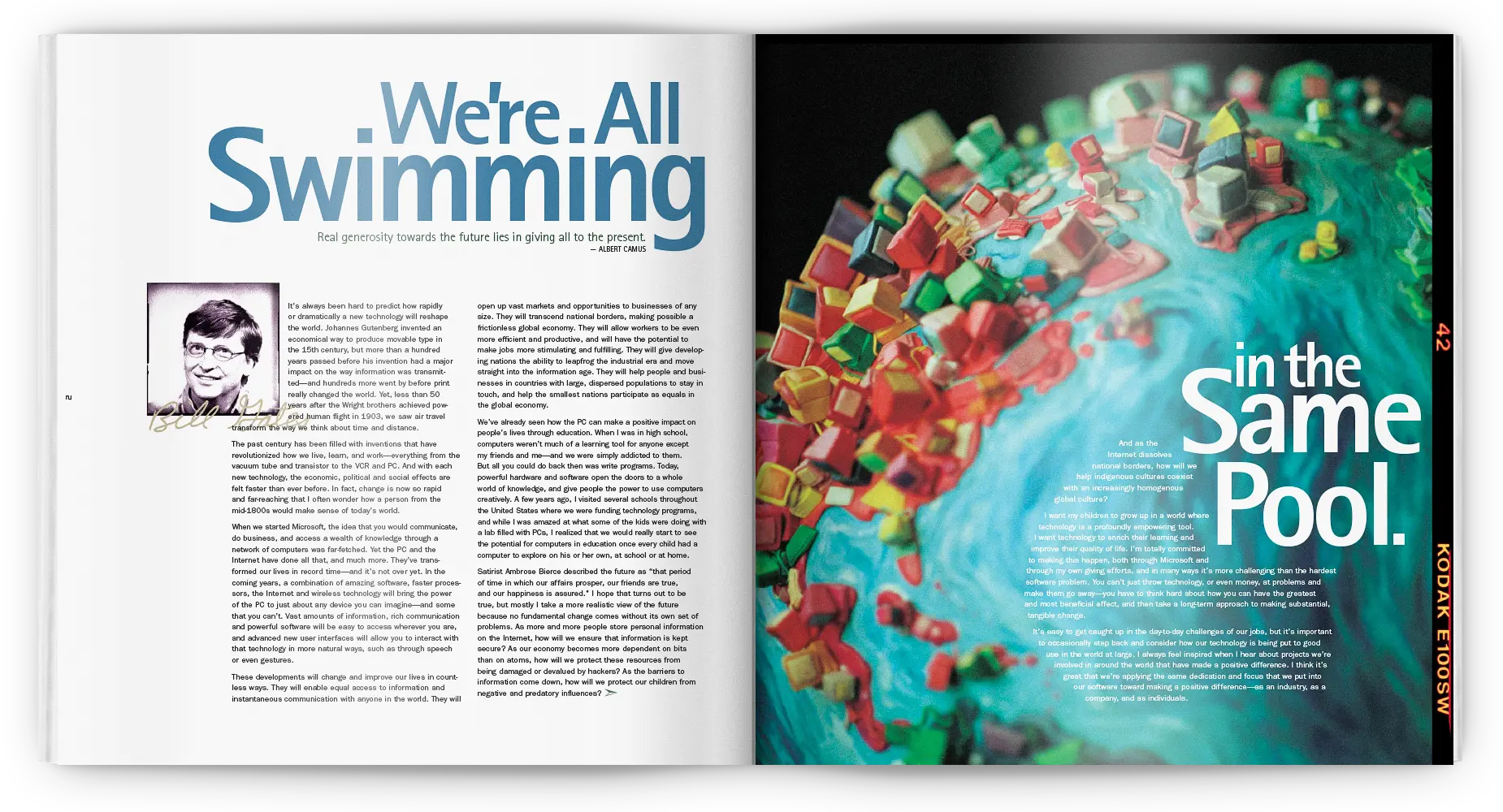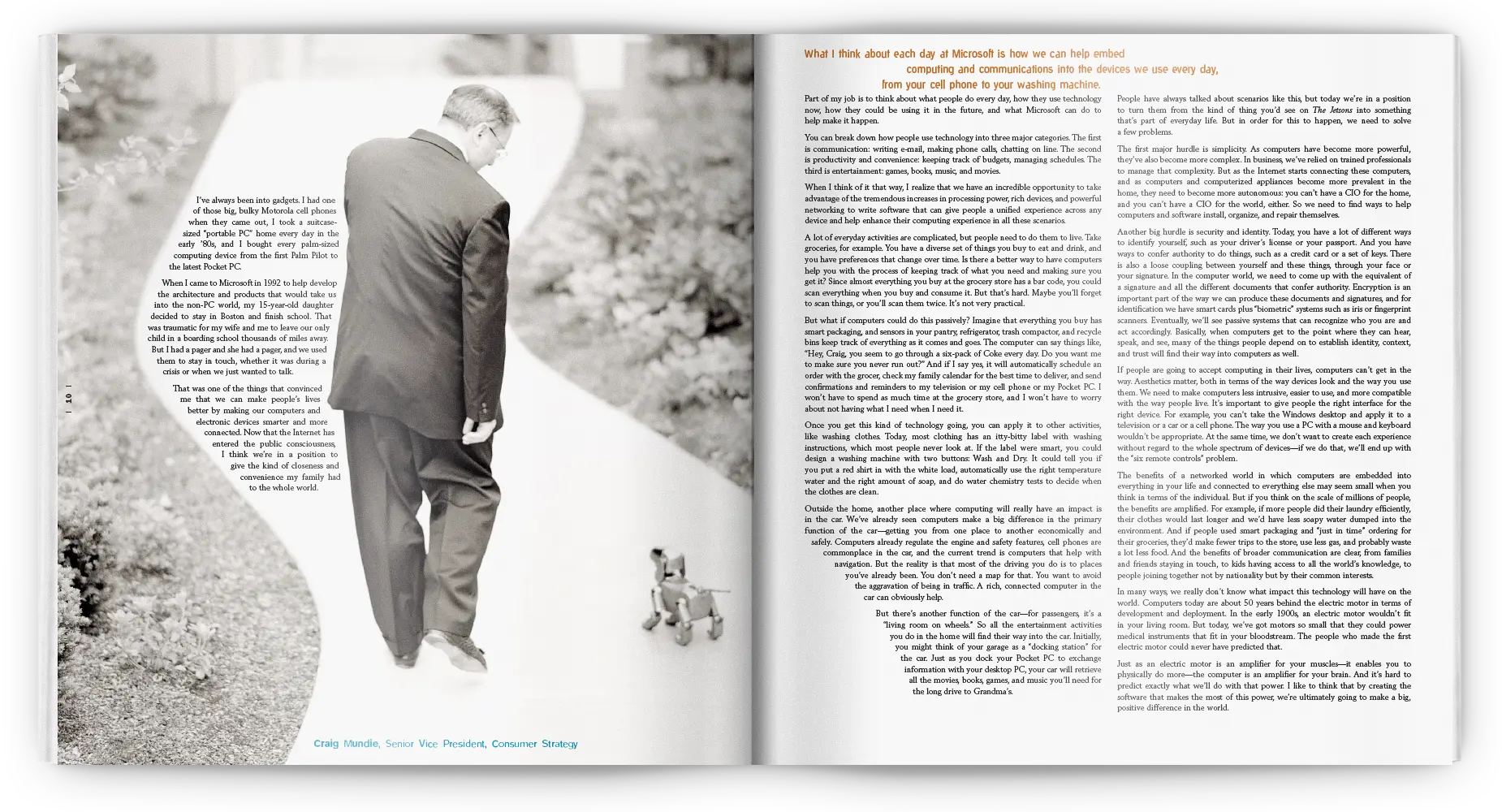 Three main goals were successfully achieved: the book was delivered to 45,000 employees (each listed in 2.5-point type in the endpapers), copies were printed domestically and internationally for bookstores, and we’re still seeing some of the images in Microsoft’s materials years later.