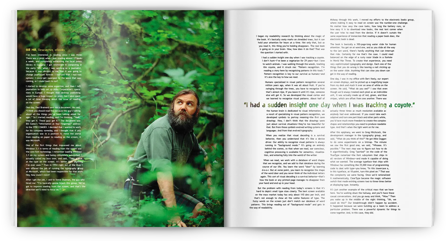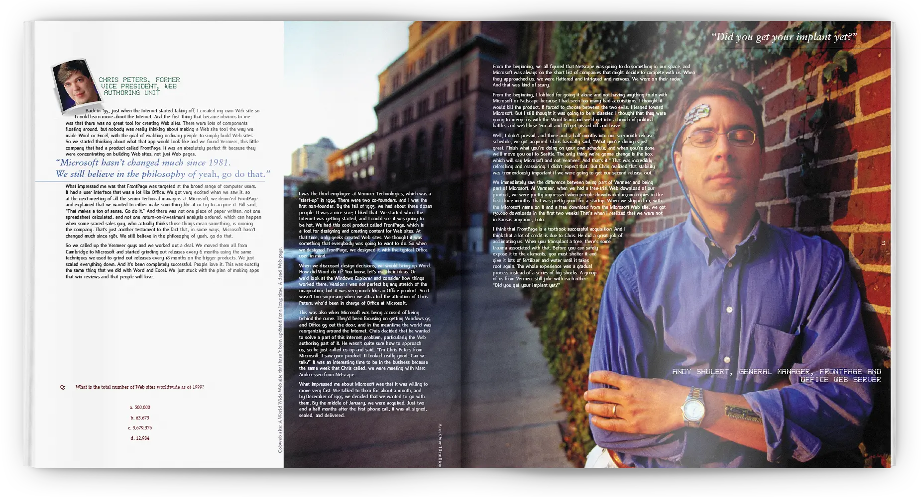 A favorite client at Microsoft (we had worked on Bill Gates’ book, The Road Ahead, a few years earlier) wanted to celebrate the 25th anniversary with something more meaningful than T-shirts and keychains. Together, we developed and pitched a concept of telling Microsoft's story through the voices of its employees. Microsoft had never authorized a book about itself, and most published works either attack the company or shower it with praise — neither capturing its true spirit. We explored the idea and divided it into five themed sections, each representing different concepts in an intimate, personal way; similar to a series of magazines.